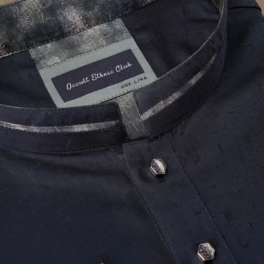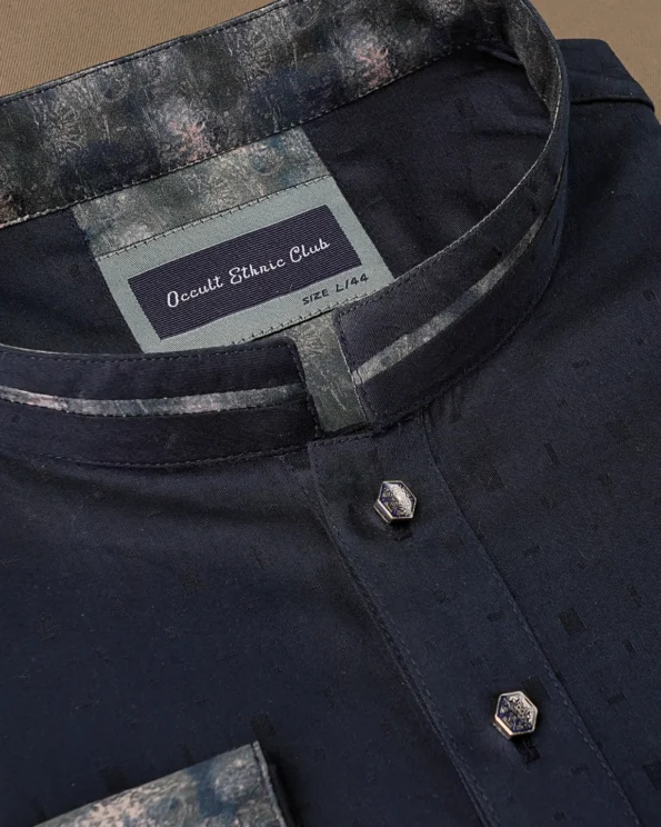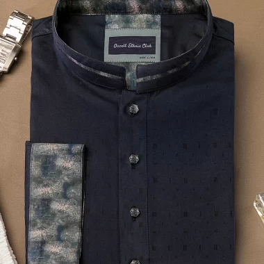 Men’s Fancy Cotton slim fit panjabi. Band collar. Collar band with contrast details, Contrast inner placket piping. Moon has cut & sew contrast design. sleeve hem with contrast on folding cuff. Back yoke with contrast loop, Long Sleeve, straight hem.