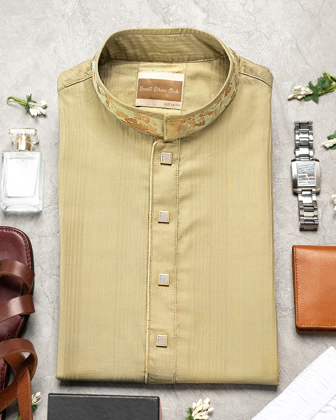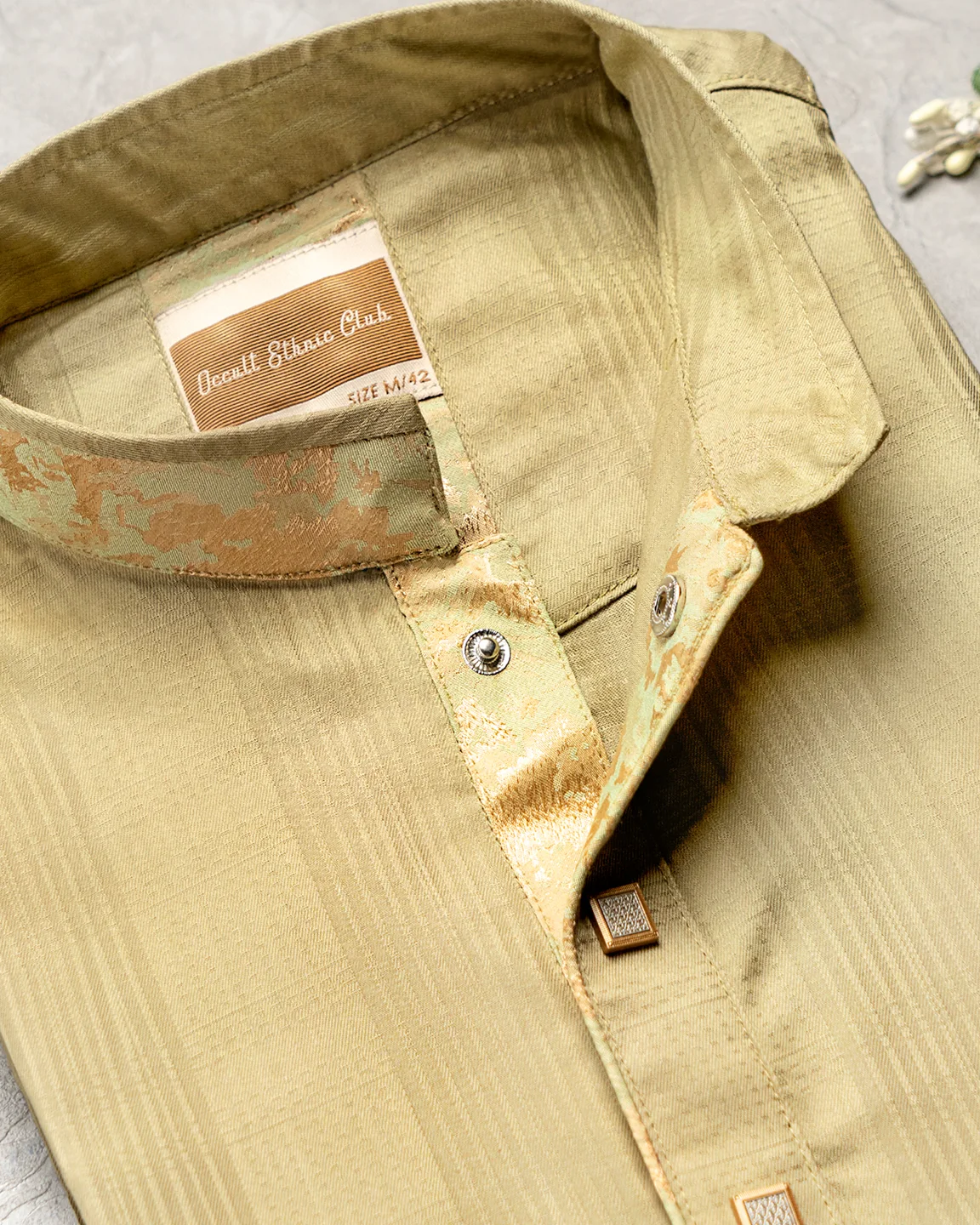 Product Description : Men’s regular fit panjabi with printed contrast band collar. Decorative metal snap buttons on the front placket with printed contrast detailing on the inner side. Crafted with fancy cotton fabric.