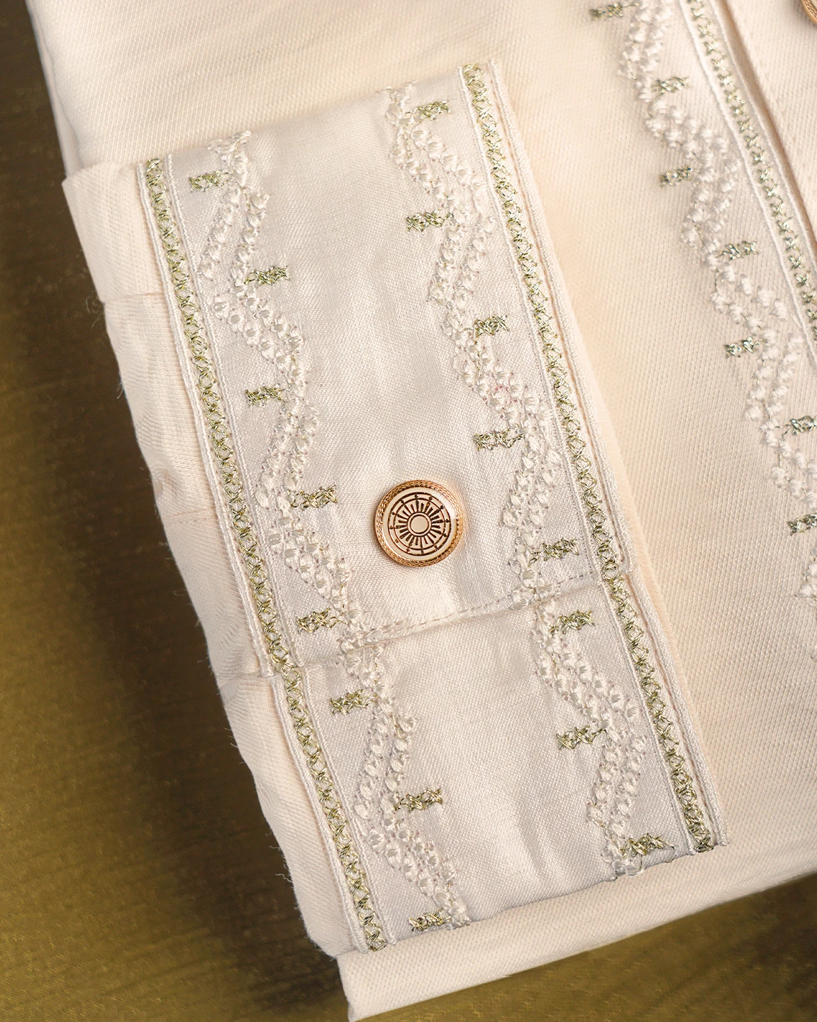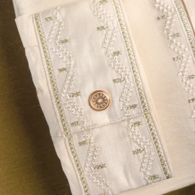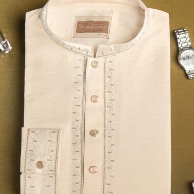 Men’s regular fit Panjabi in viscose fabric with band collar & sleeve cuff piping details. Decorative stitch & metal snap button, long Sleeve, straight hem.