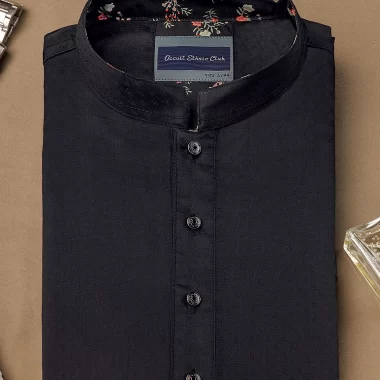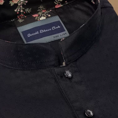 Me Men’s fancy cotton slim fit panjabi. Band Collar with decorative stitch & inner band has contrast piping. Button placket with show button & decorative stitch. Moon has cut & sew contrast design. Long Sleeve, straight hem.