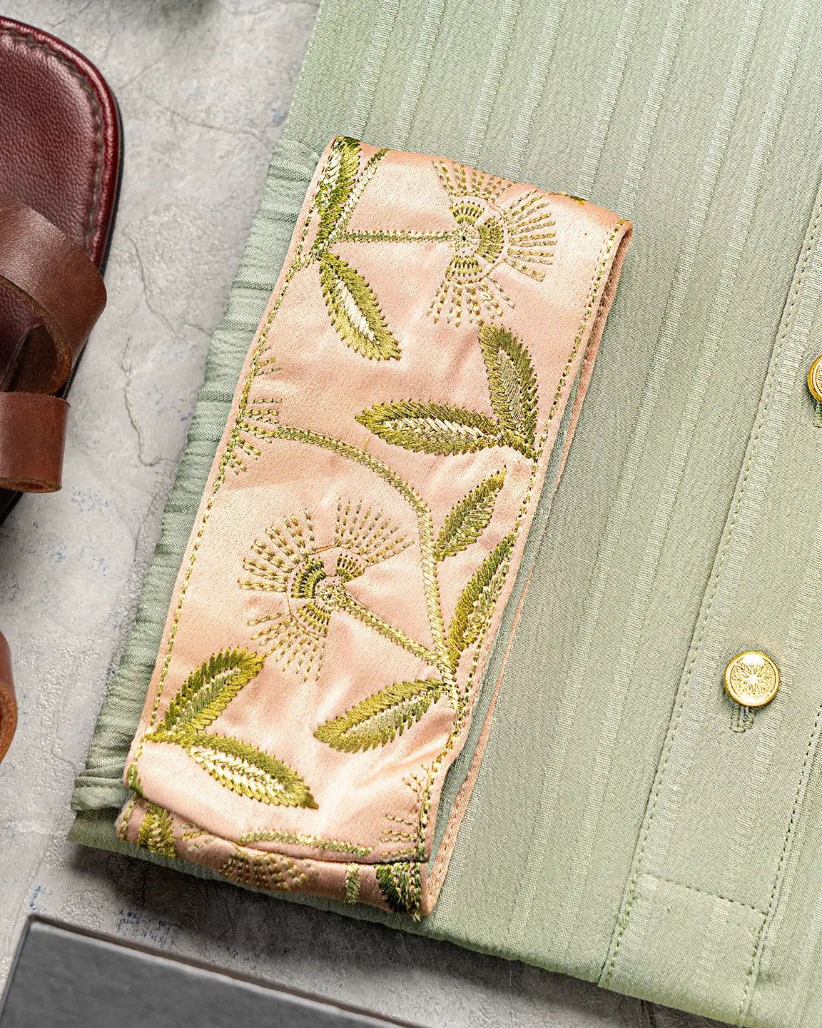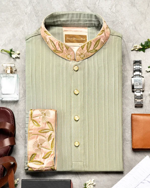 Product Description : Men’s slim fit panjabi with embroidered band collar. Decorative metal buttons on the front placket. Matching cuffs with embroidery detailing. Crafted with lyocell fabric.