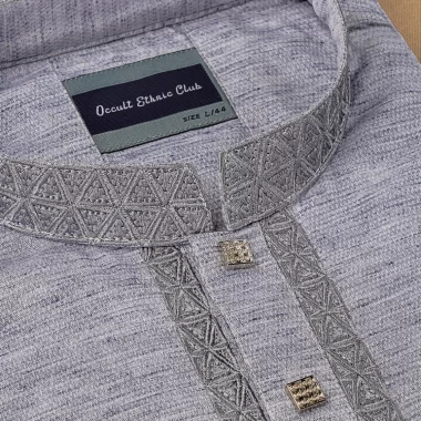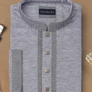 Men’s Fancy Cotton semi slim fit panjabi. Collar band embroidery design. Moon has cut & sew design. Sleeve on embroidery design. Long Sleeve, straight hem.