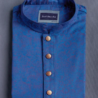 Men’s regular fit panjabi in viscose fabric with band collar  & sleeve cuff piping details. Decorative stitch &  metal snap button, long Sleeve, straight hem.