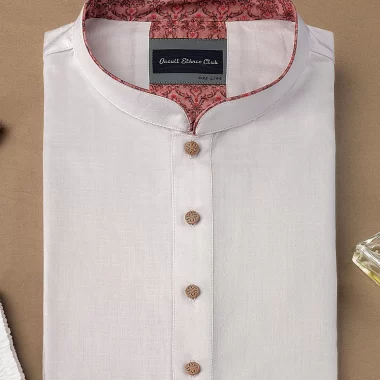 Men’s fancy cotton slim fit panjabi. Band Collar with contrast piping. Button placket with contrast fabric piping & show button. Moon has cut & sew contrast design. Long Sleeve with contrast piping, straight hem.
