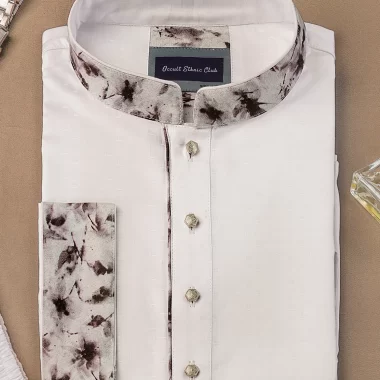 Men’s Fancy Cotton slim fit panjabi. Band collar. Collar band with contrast details, Contrast inner placket piping. Moon has cut & sew contrast design. sleeve hem with contrast on folding cuff. Back yoke with contrast loop, Long Sleeve, straight hem.