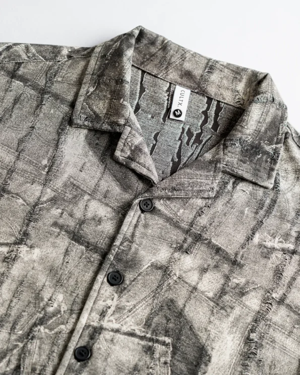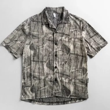 Product Description: Regular-fit printed shirt with cuban collar, short sleeves, back yoke, slightly curved hemline, and a branded side label detailing. Crafted with textured cotton mix fabric.