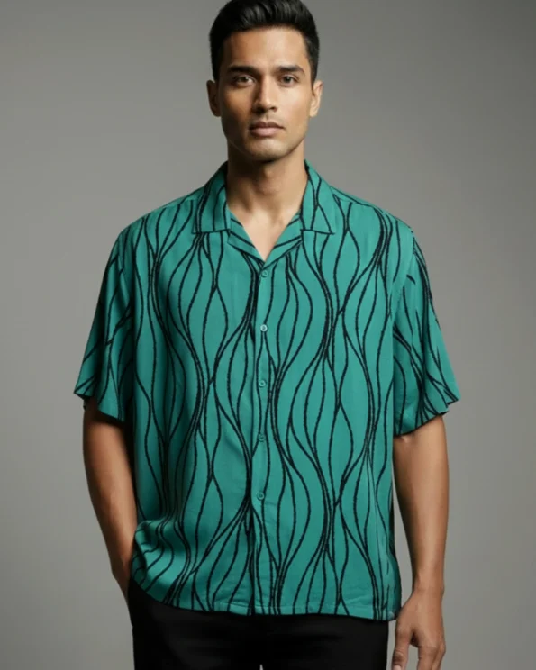 Product Description: Oversized-fit printed shirt with cuban collar, short sleeves, back yoke, straight hemline, and a branded hem label detailing. Crafted with viscose cotton fabric.
