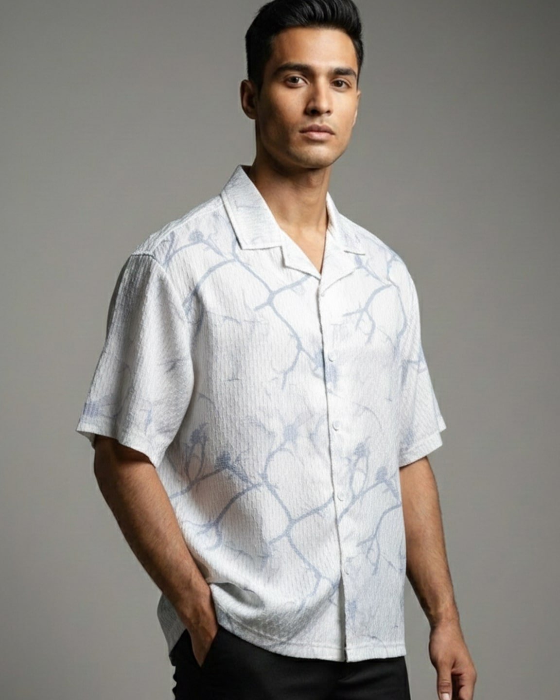 Product Description: Relaxed-fit printed shirt with cuban collar, short sleeves, back yoke, straight hemline, and a branded side label detailing. Crafted with fancy cotton fabric.