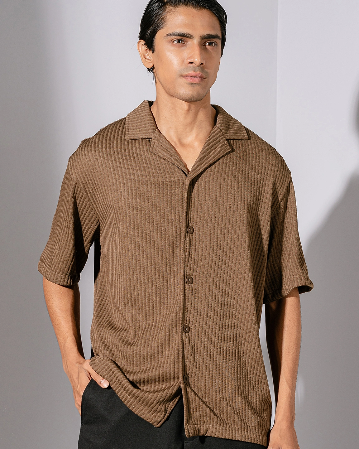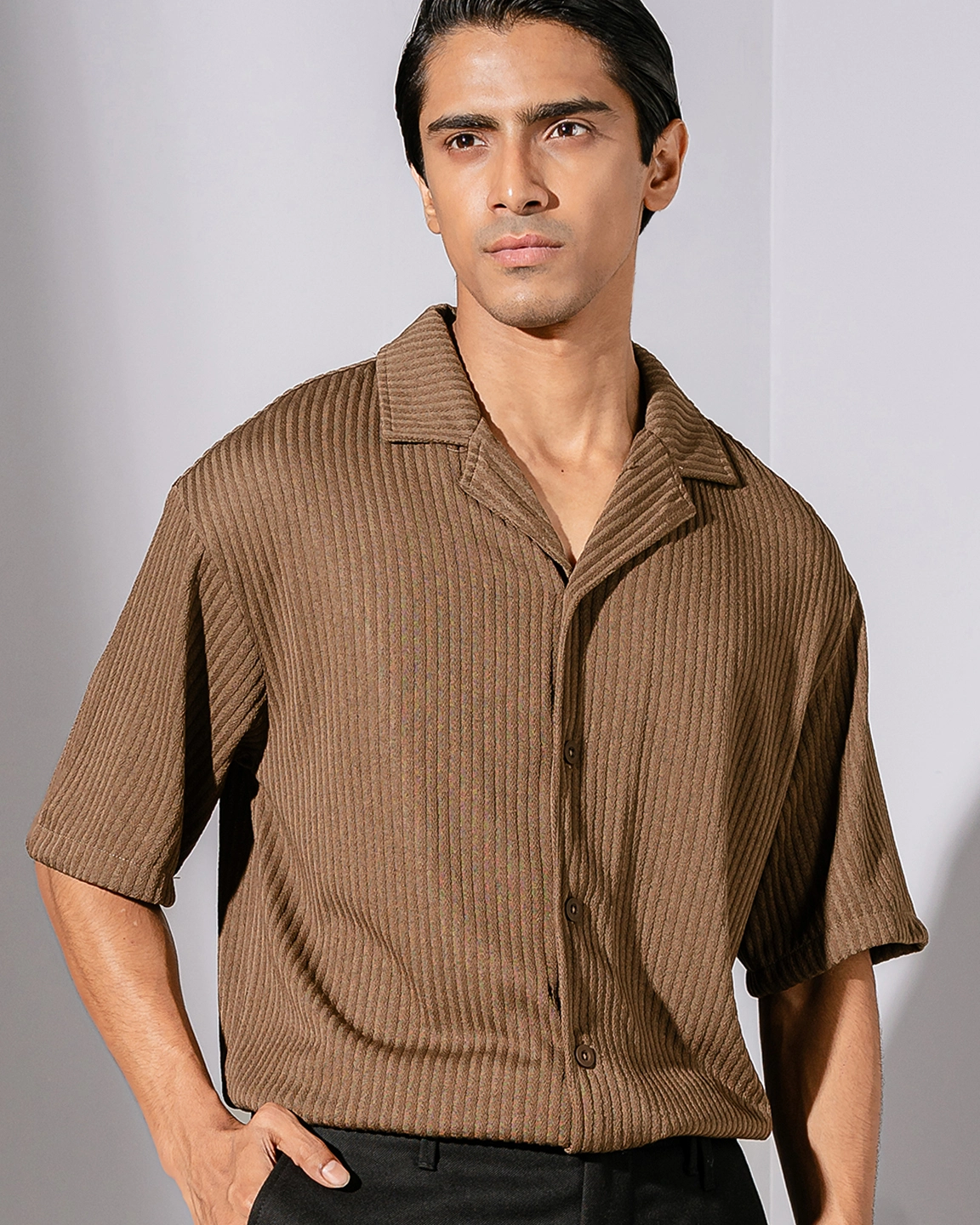 Product Description: Relaxed fit cuban collar shirt with short sleeve, back yoke and straight hem.