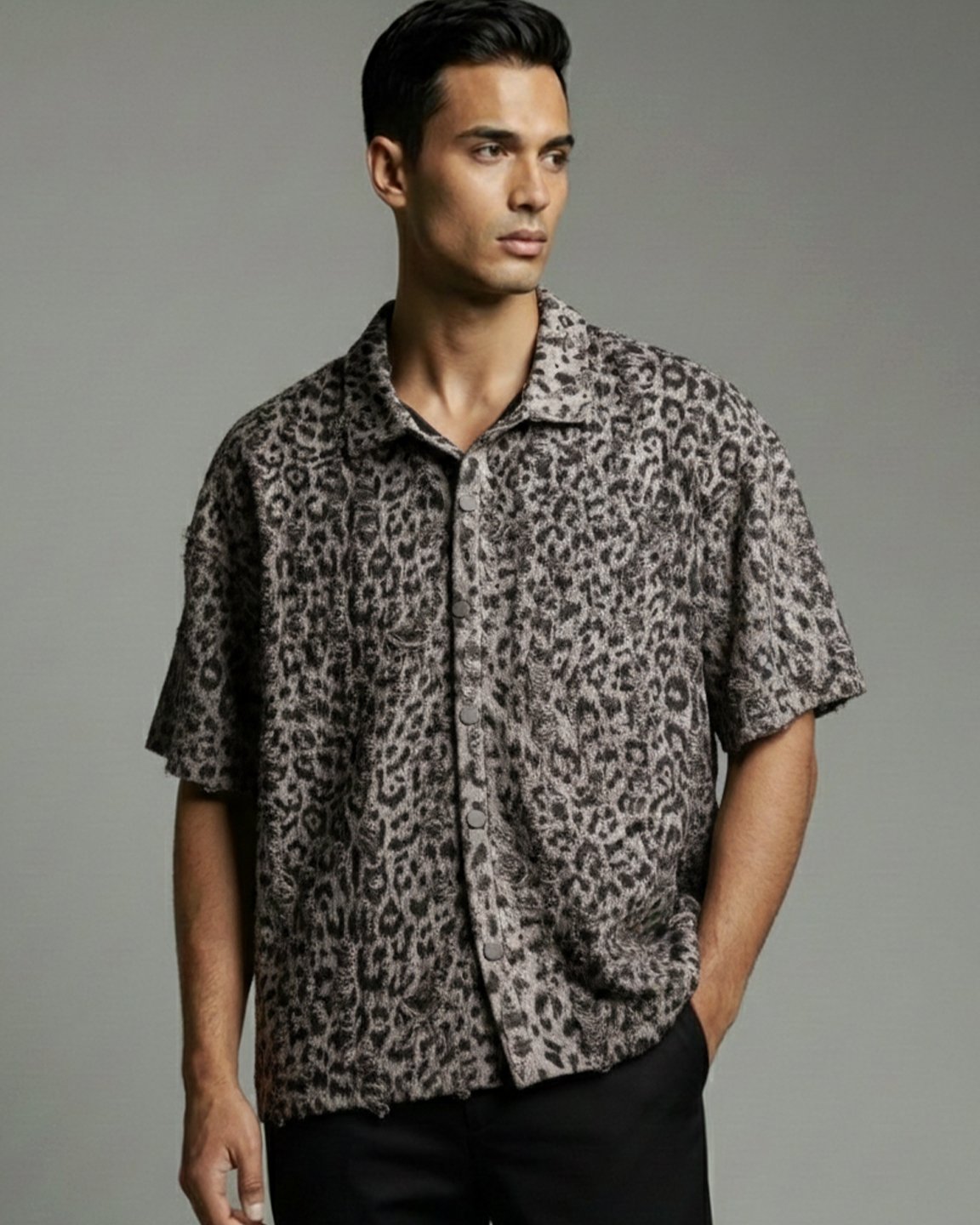 Product Description: Regular-fit 3D printed shirt with snap-button front closure, short sleeves, back yoke, straight hemline. Crafted with 3D printed knit fabric.