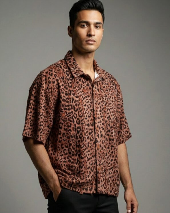 Product Description: Regular-fit 3D printed shirt with snap-button front closure, short sleeves, back yoke, straight hemline. Crafted with 3D printed knit fabric.