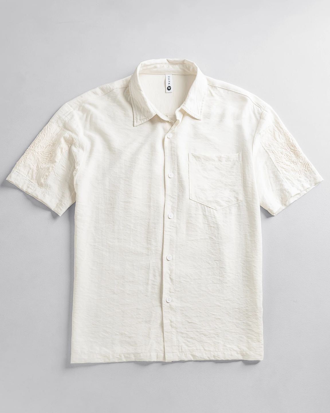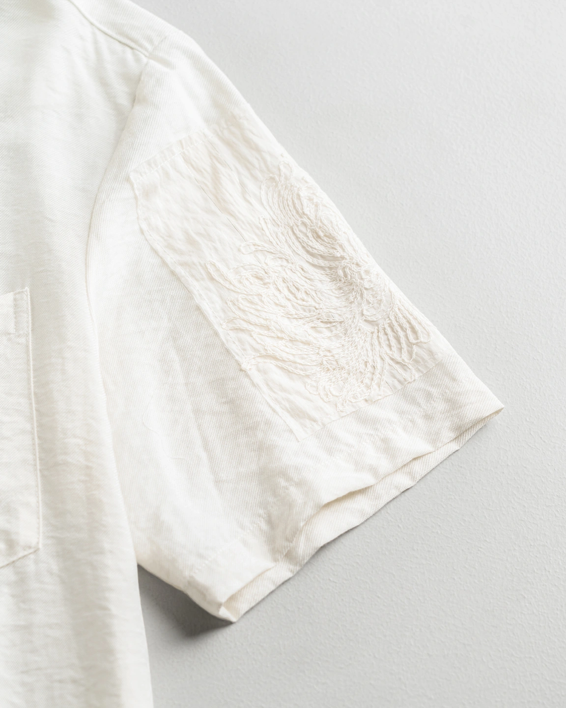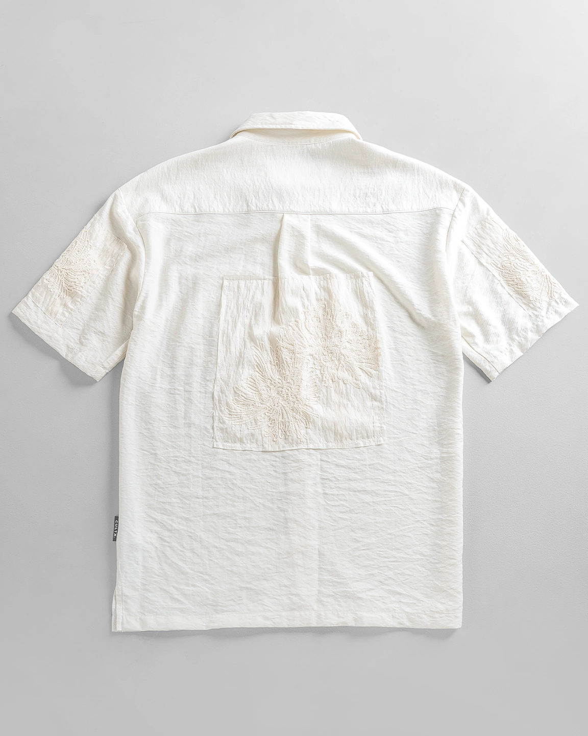 Product Description: Regular-fit shirt with spread collar, single chest pocket, short sleeves, embroidery detailing in sleeves and back, back yoke, and straight hem.