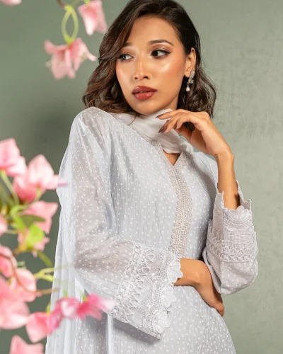 Product Details: A lightweight premium Chiffon Georgette dupatta with a soft sheer drape, finished with delicate lace edging for an elegant festive look.