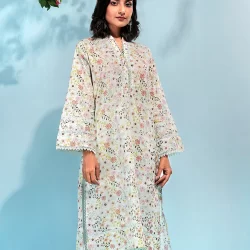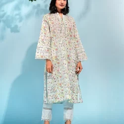 Cotton A-line long kurta has band neck with lace details, front part has lace details, has full sleeve with lace details, has bothside slits.