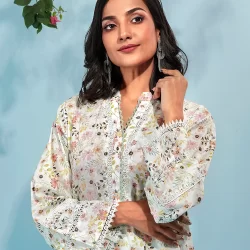 Cotton A-line long kamiz has v-neck with lace details, front hemline has lace details, has bothside slits, has full sleeve lace details.