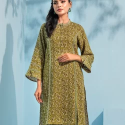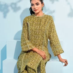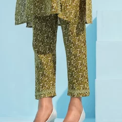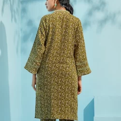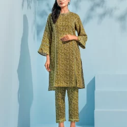 Printed cotton co-ord kurta and bottom set by AMNA | Olive Green