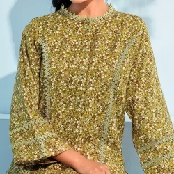 Cotton A-line 2pcs has round neck neck, has front placket with lace details, has bothside slits, has full sleeve with hemline lace details, has wide hem bottom with hemline lace details, has back side cut, has front waist band & back side has elastic.