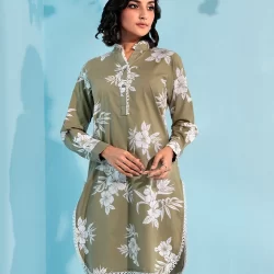 Cotton A-line 2pcs has band collar has front placket with lace details, has bothside slits, has full sleeve with hemline lace details, has wide hem bottom with hemline lace details, has back side cut, has front waist band & back side has elastic.