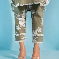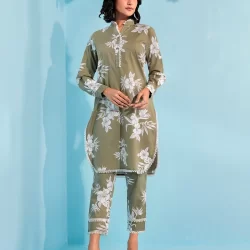 Printed cotton co-ord kurta and bottom set by AMNA | Pale Olive