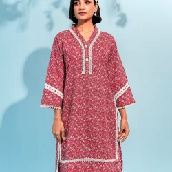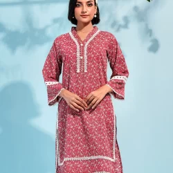 Cotton A-line 2pcs has v neck neck, has front placket with lace details, has bothside slits, has full sleeve with hemline lace details, has wide hem bottom with hemline lace details, has back side cut, has front waist band & back side has elastic.