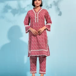 Printed cotton co-ord kurta and bottom set by AMNA | True Red