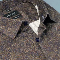 Digital printed cotton tailored fit woven shirt, long sleeve, no a pocket, tie collar, front classic placket, curved hem.
