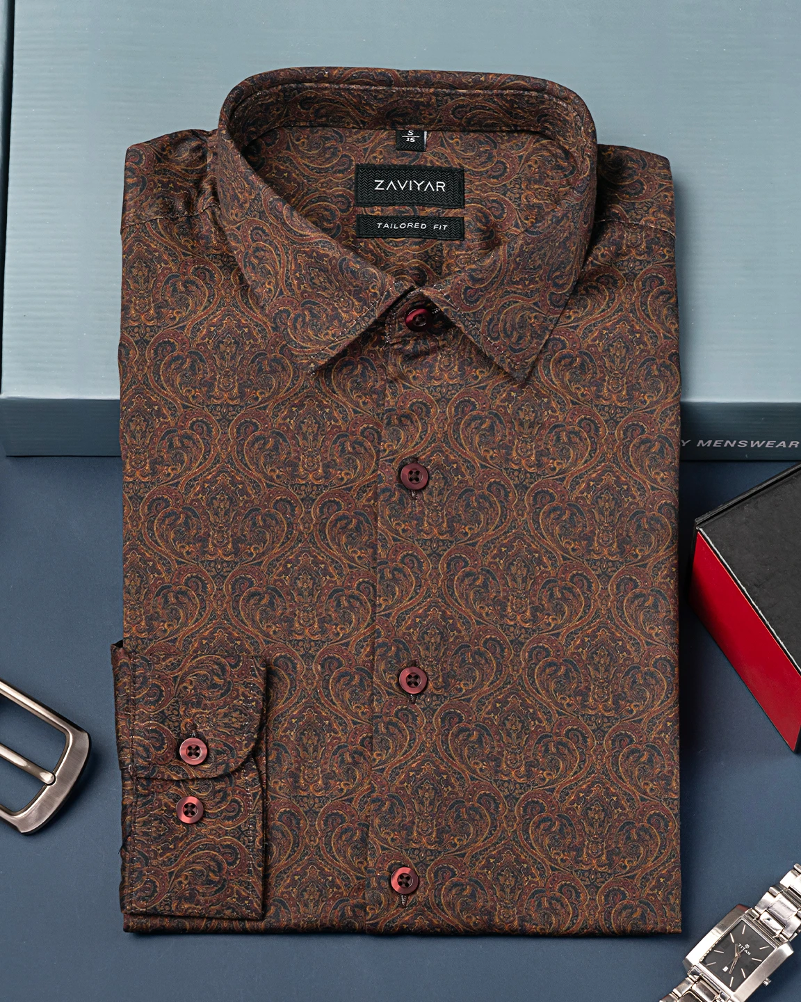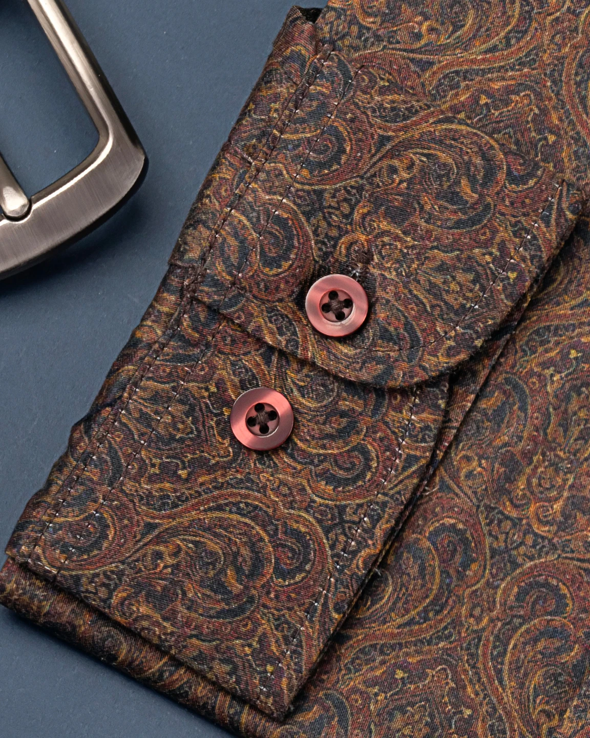 Digital printed cotton tailored fit woven shirt, long sleeve, no a pocket, tie collar, front classic placket, curved hem.