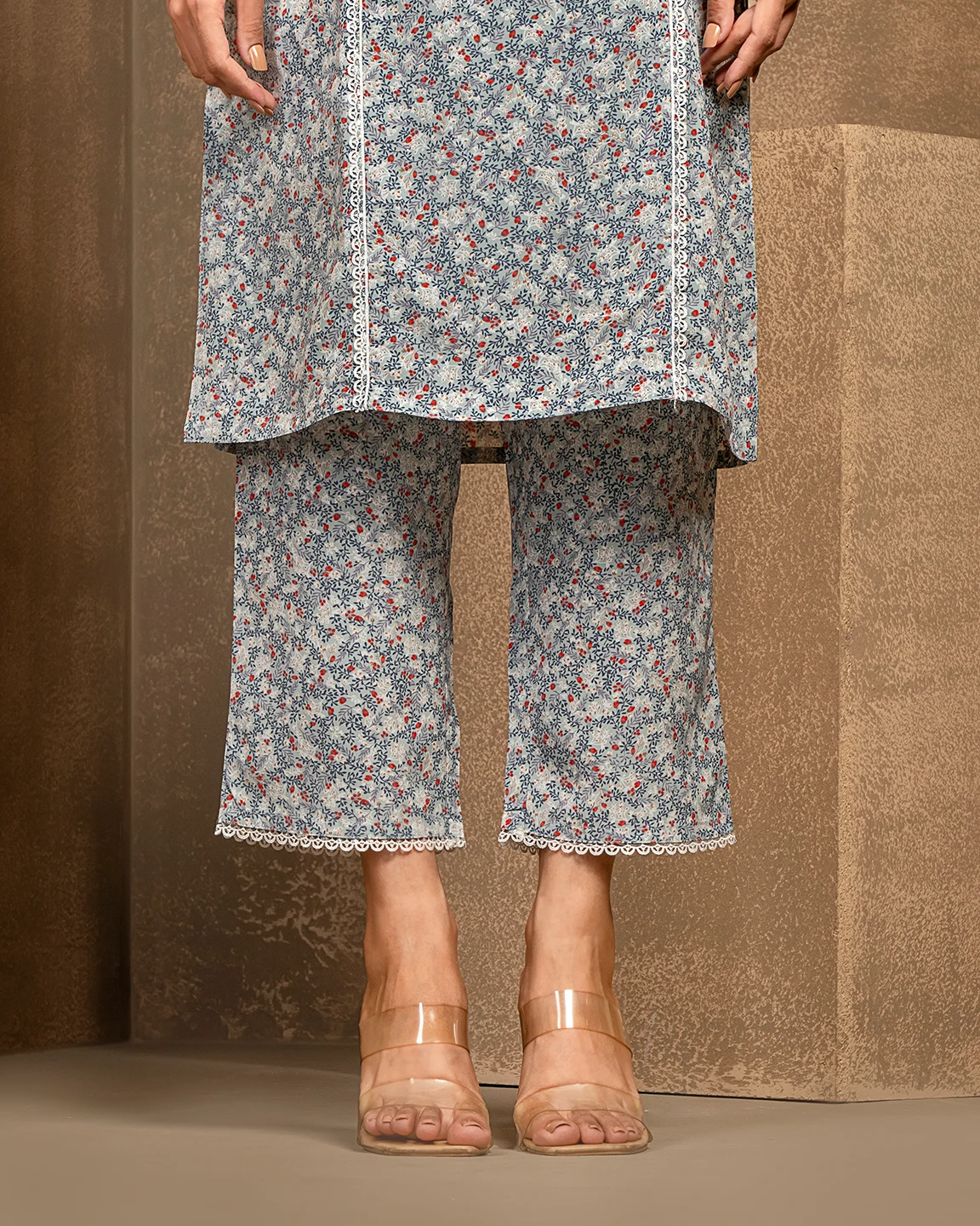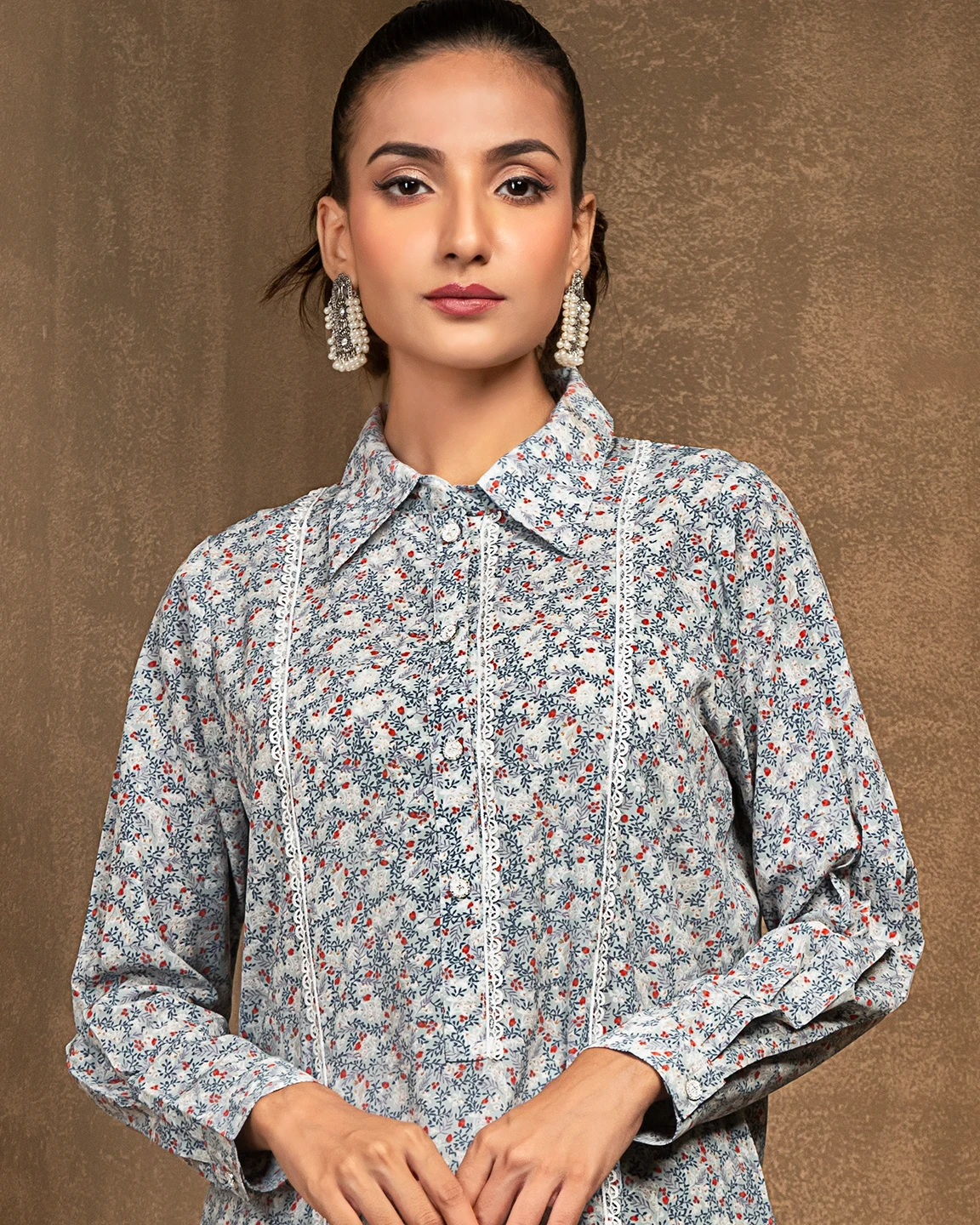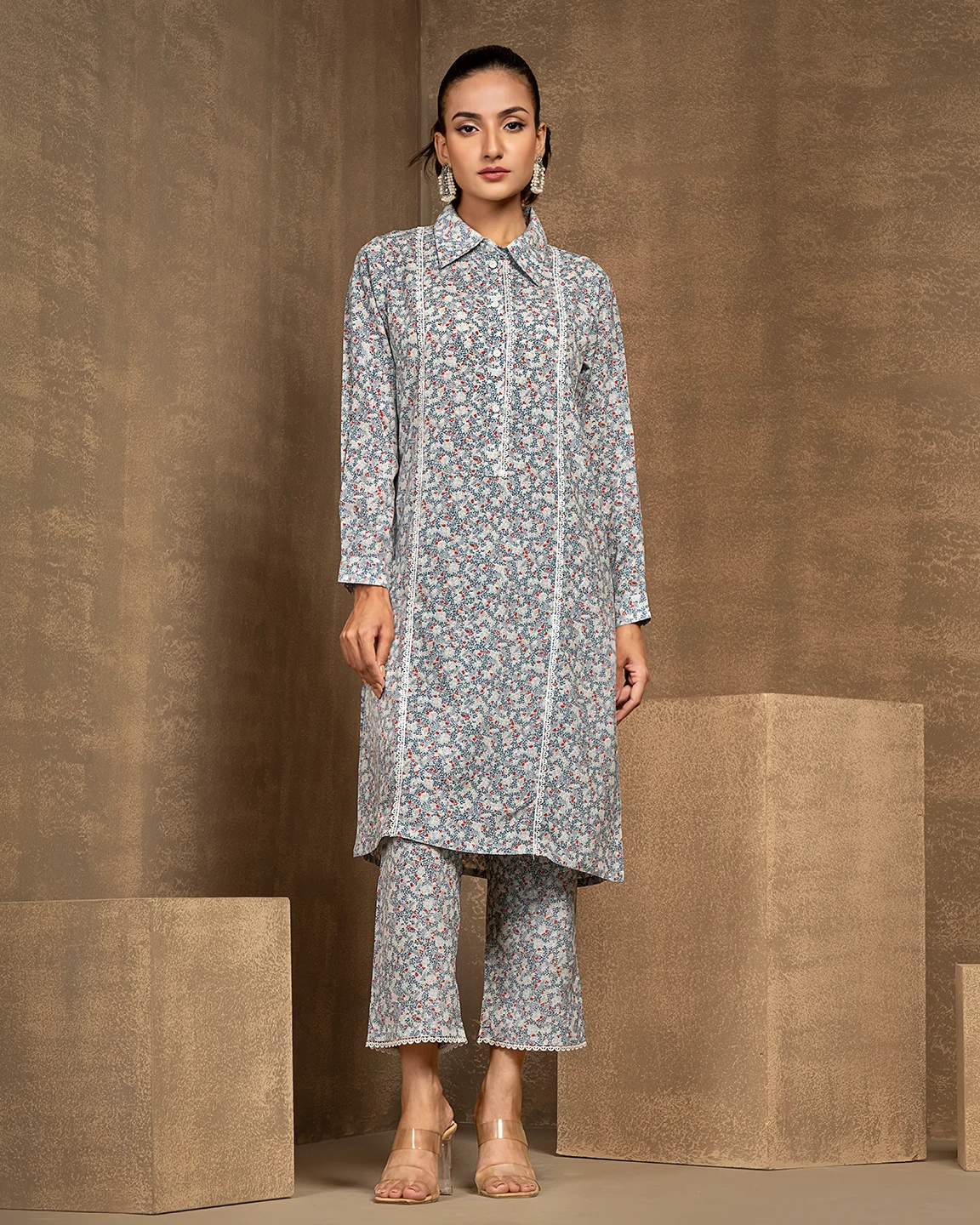 Printed Shirt Collar Co-Ord Set With Lace Details | Arctic Blue