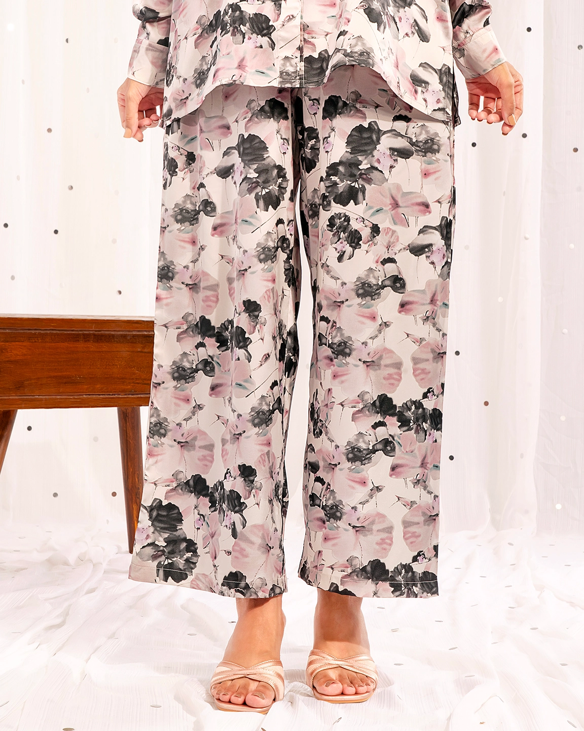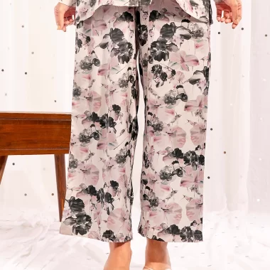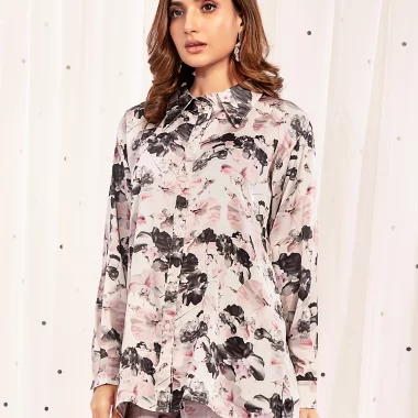 Sold OutPrinted Shirt Collar Double Silk Co-Ord Set | Daisy White