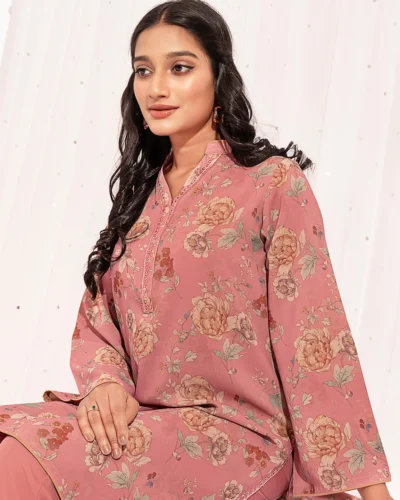 Female Band Collar-V Neck Details Luxury Printed Georgette Short Kameez | Mauvwood Pink