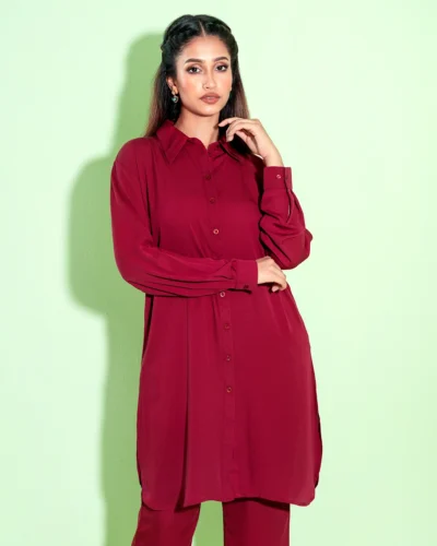 Female Shirt Collar Details Luxury Georgette Co-Ord Set | Maroon