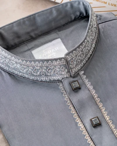 Product Description : Men’s regular fit panjabi with embroidered band collar. The front placket is line finished with decorative metal buttons. Matching cuffs with embroidery. Crafted with bamboo silk fabric.