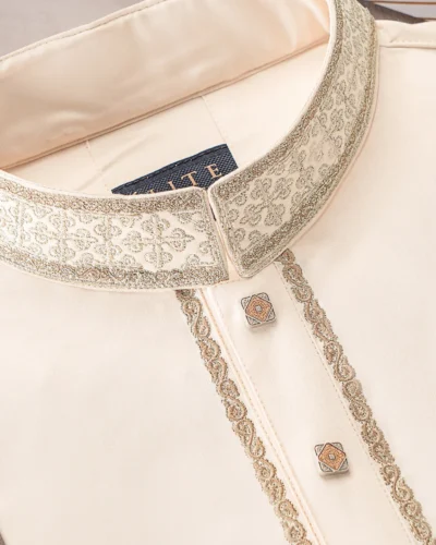 Product Description : Men’s regular fit panjabi with embroidered band collar. The front placket is lined with delicate embroidery and finished with decorative metal buttons. Matching cuffs with embroidery and button detailing. Crafted with jacquard cotton fabric.
