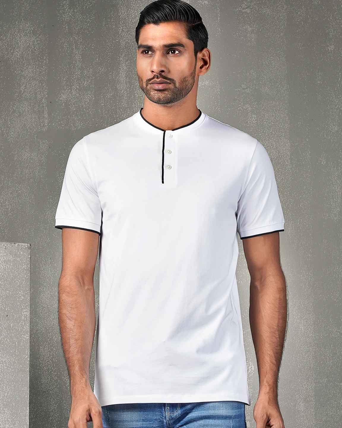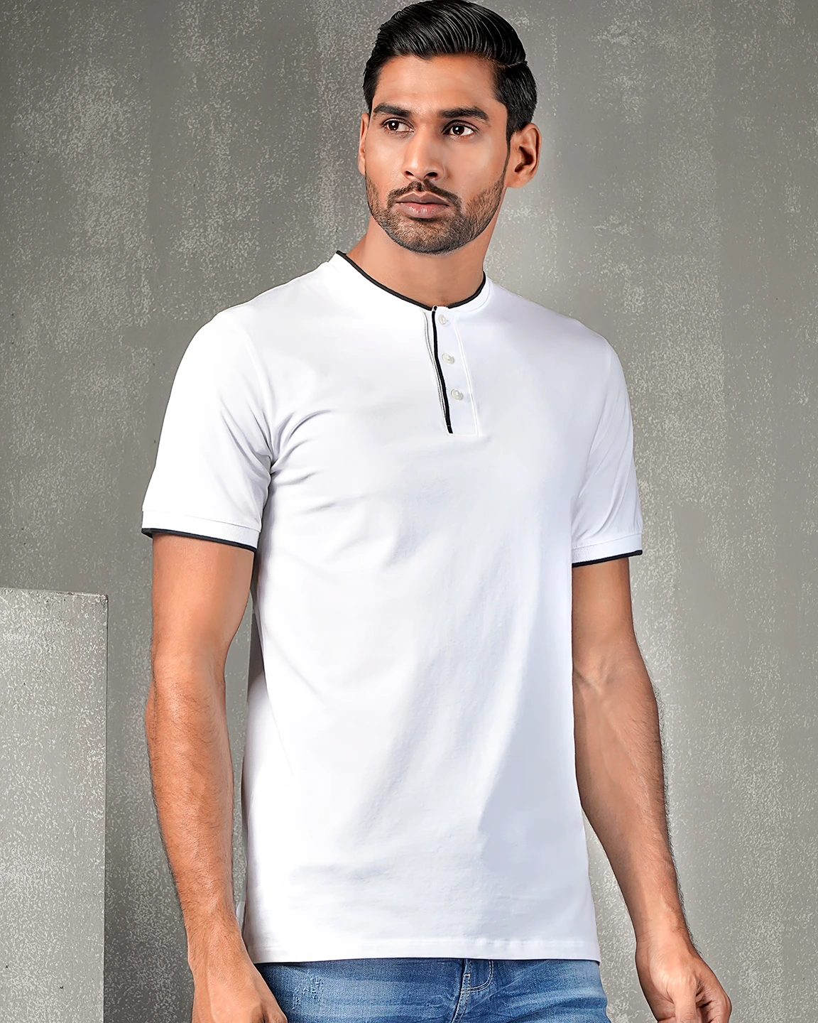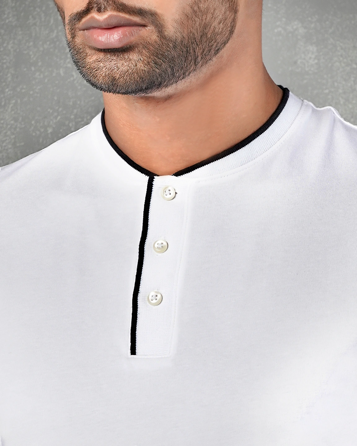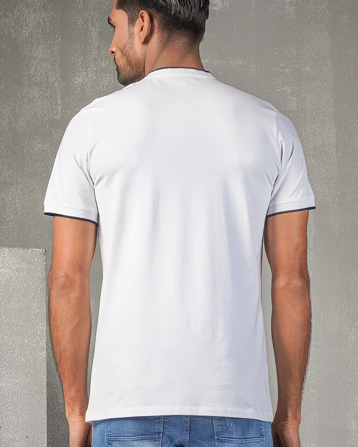 T-Shirt. Round neck and neck has rib details. Neck opening with Rib button placket. Short sleeve & sleeve rib cuff, straight hem.