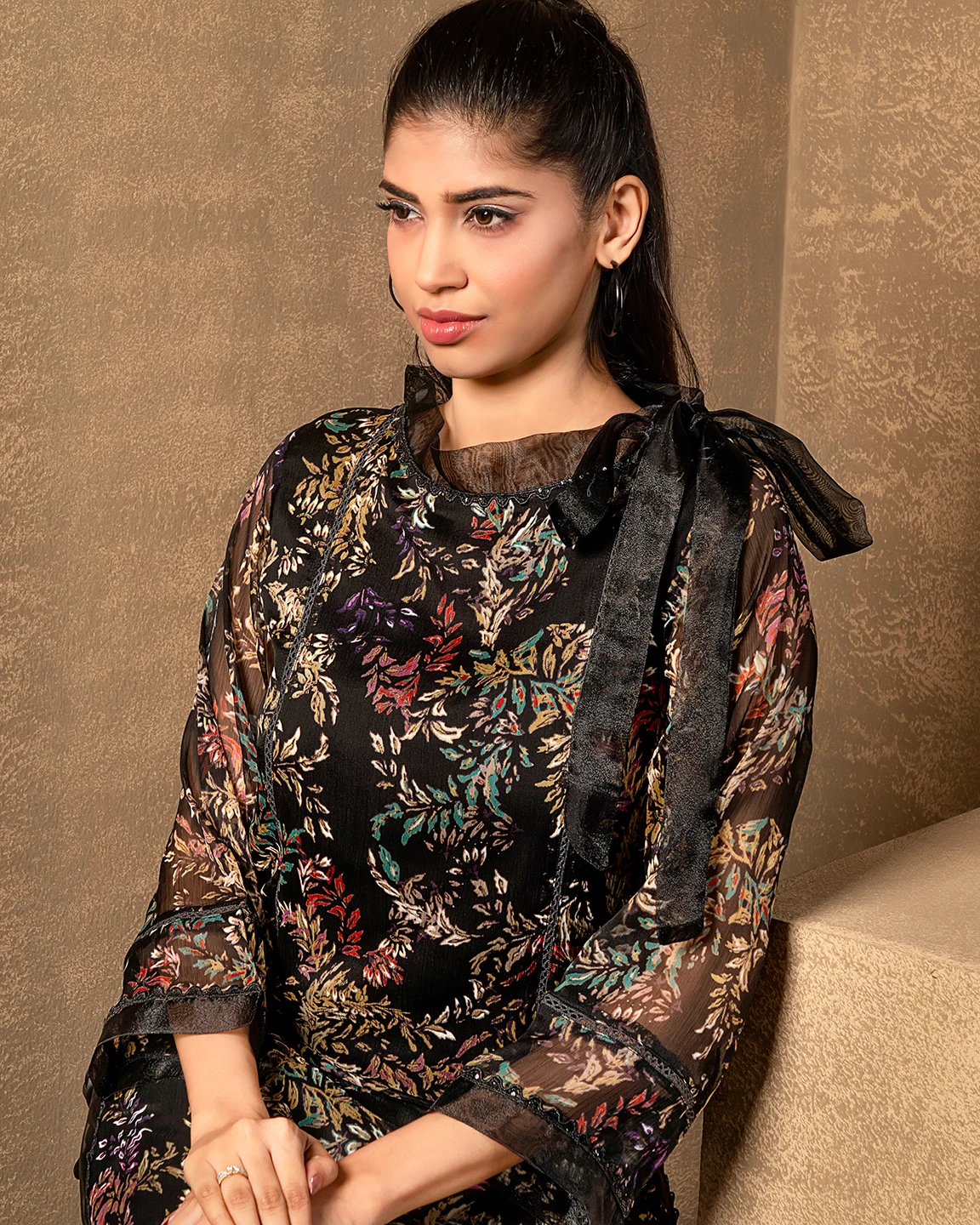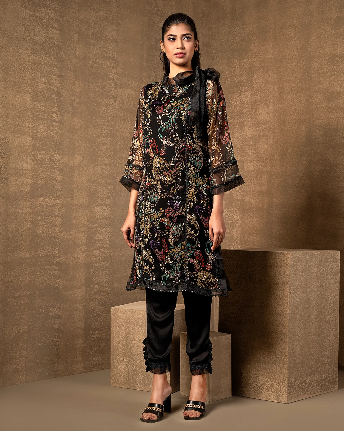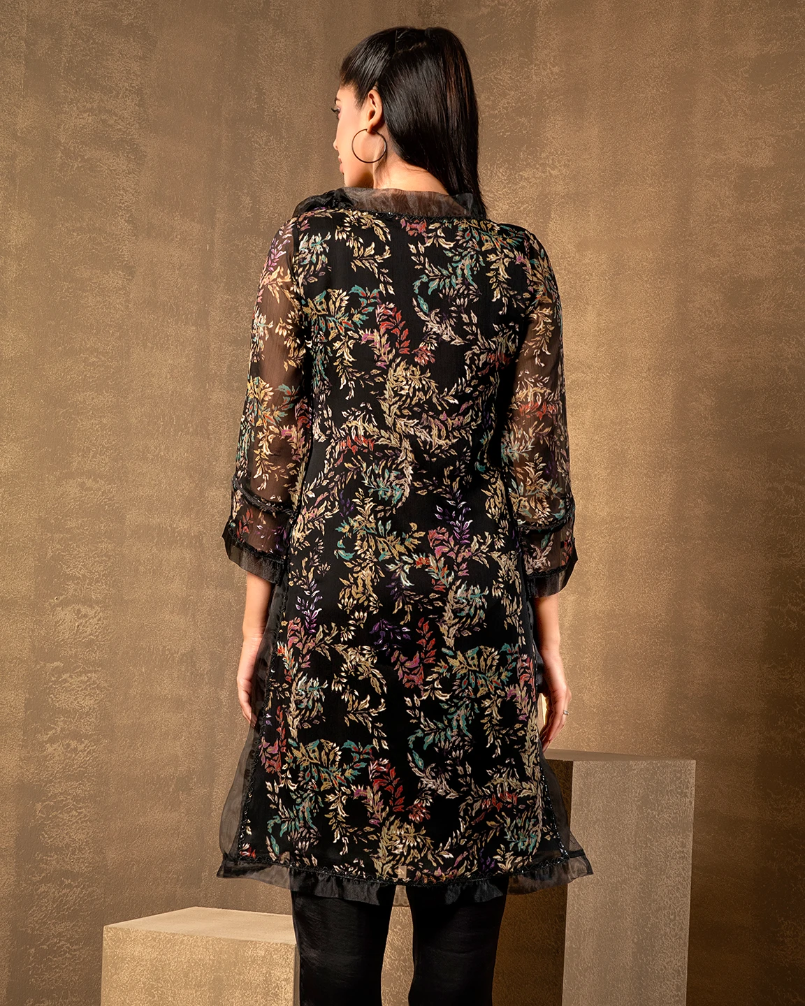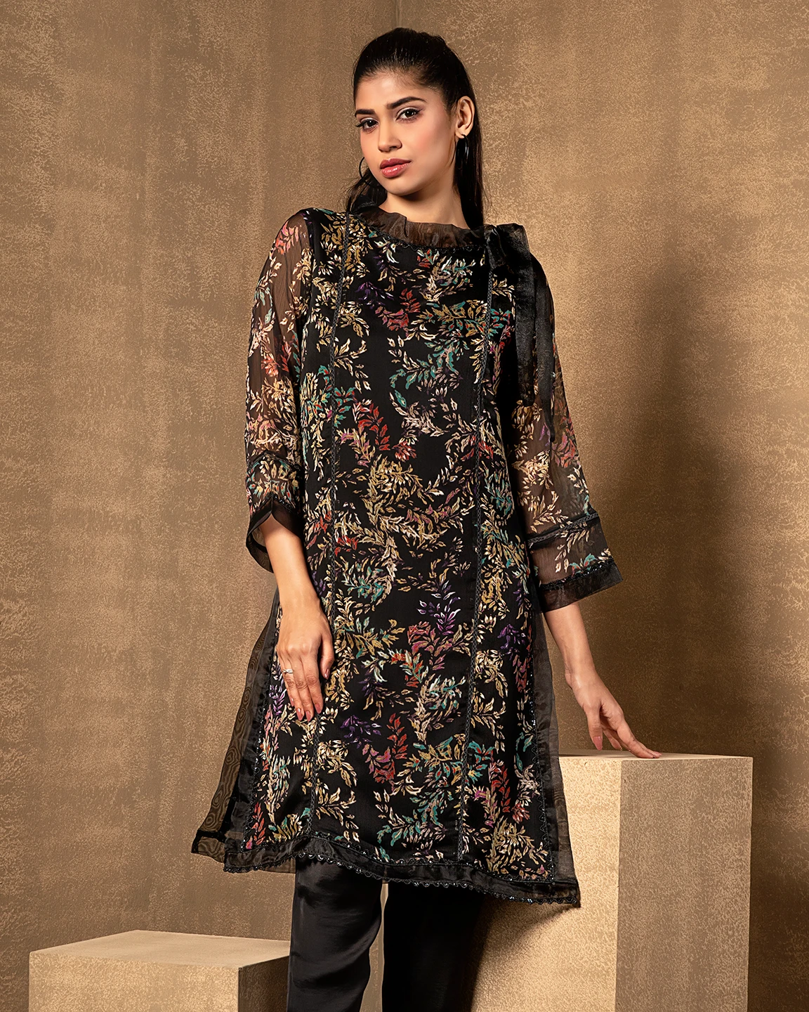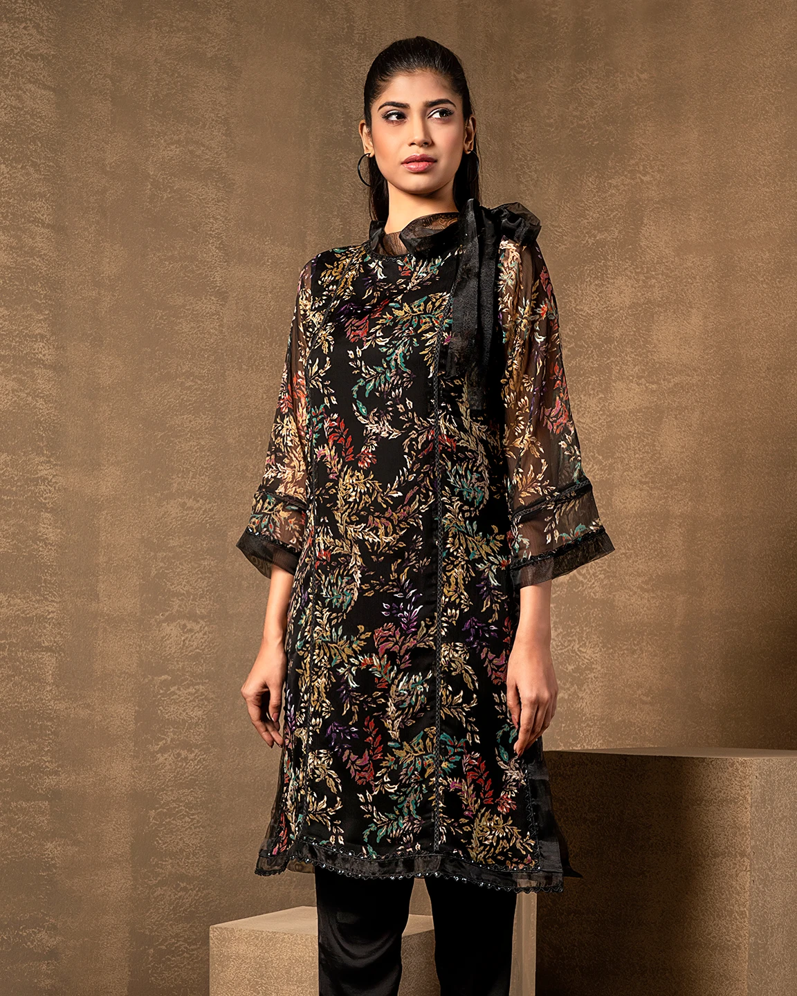 Round Neck With Tissue Tie Long Kameez | Black Print