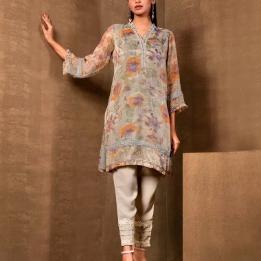 Luxury Georgette Short Kameez has V-neck with lace details, has front hemline lace details, has front hemline ruffle & lace details, has side lace details, has full sleeve hemline ruffle & lace details and attached lining.