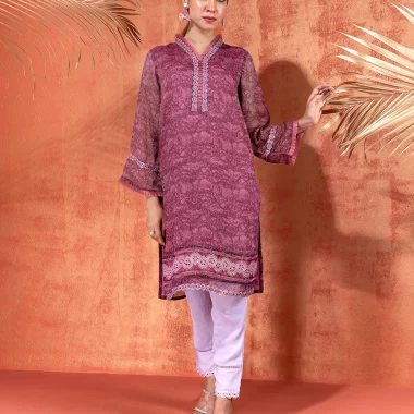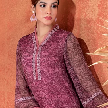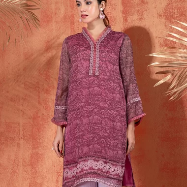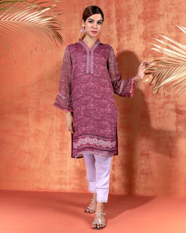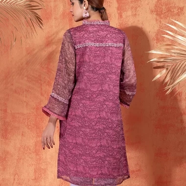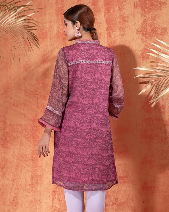 Fine Georgette Short kamiz has v-neck with contrast tissue ruffle & lace details, has hemline contrast pannel with lace details, has hemline lace details, has full sleeve lace details, has back yoke lace details, has butter lining for easy & comfort.