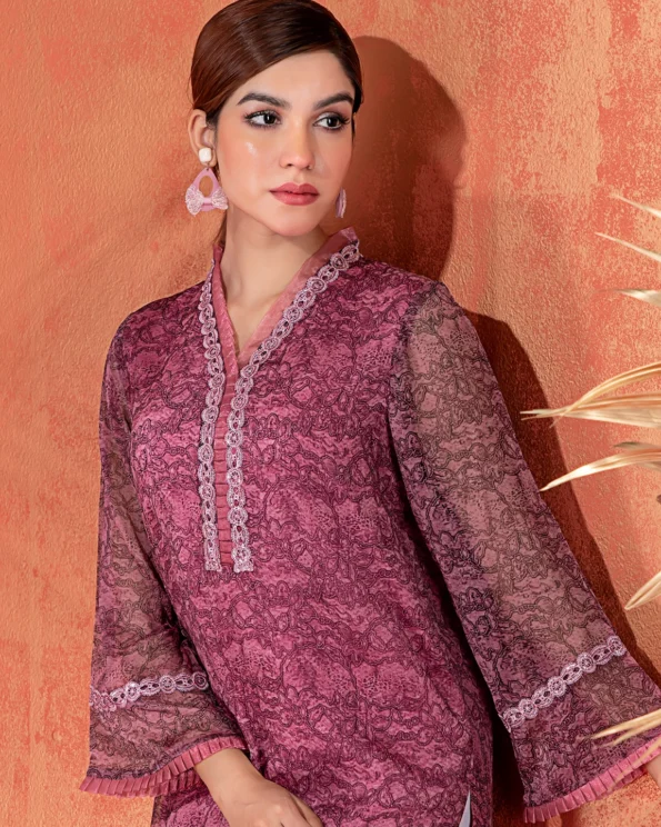 Ruffled V-neck Short Kameez With Lace | Lavender Pink