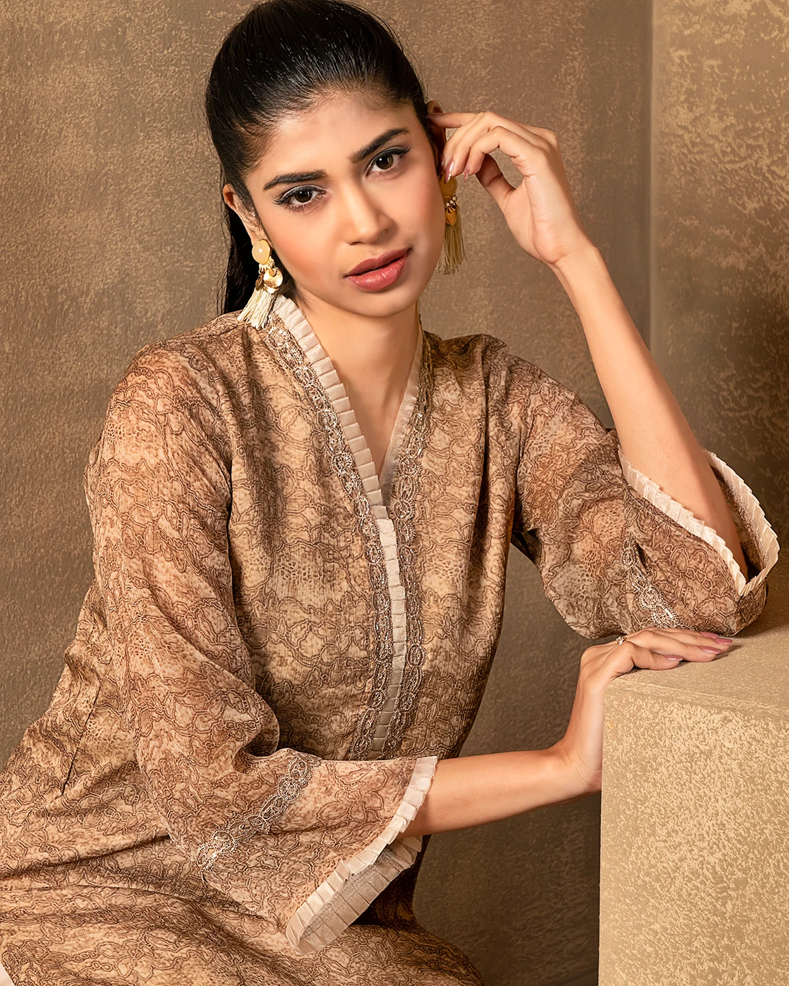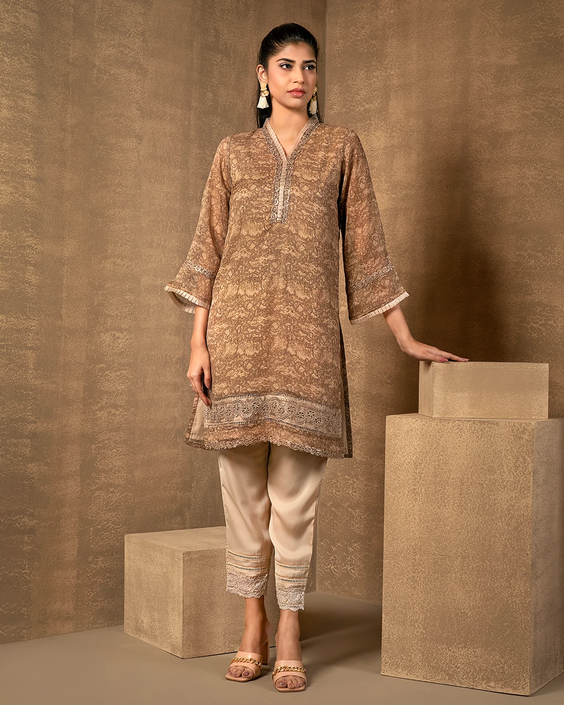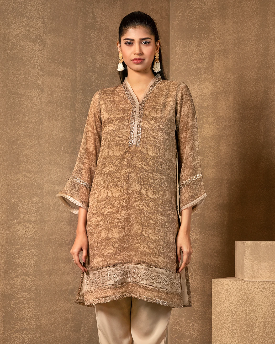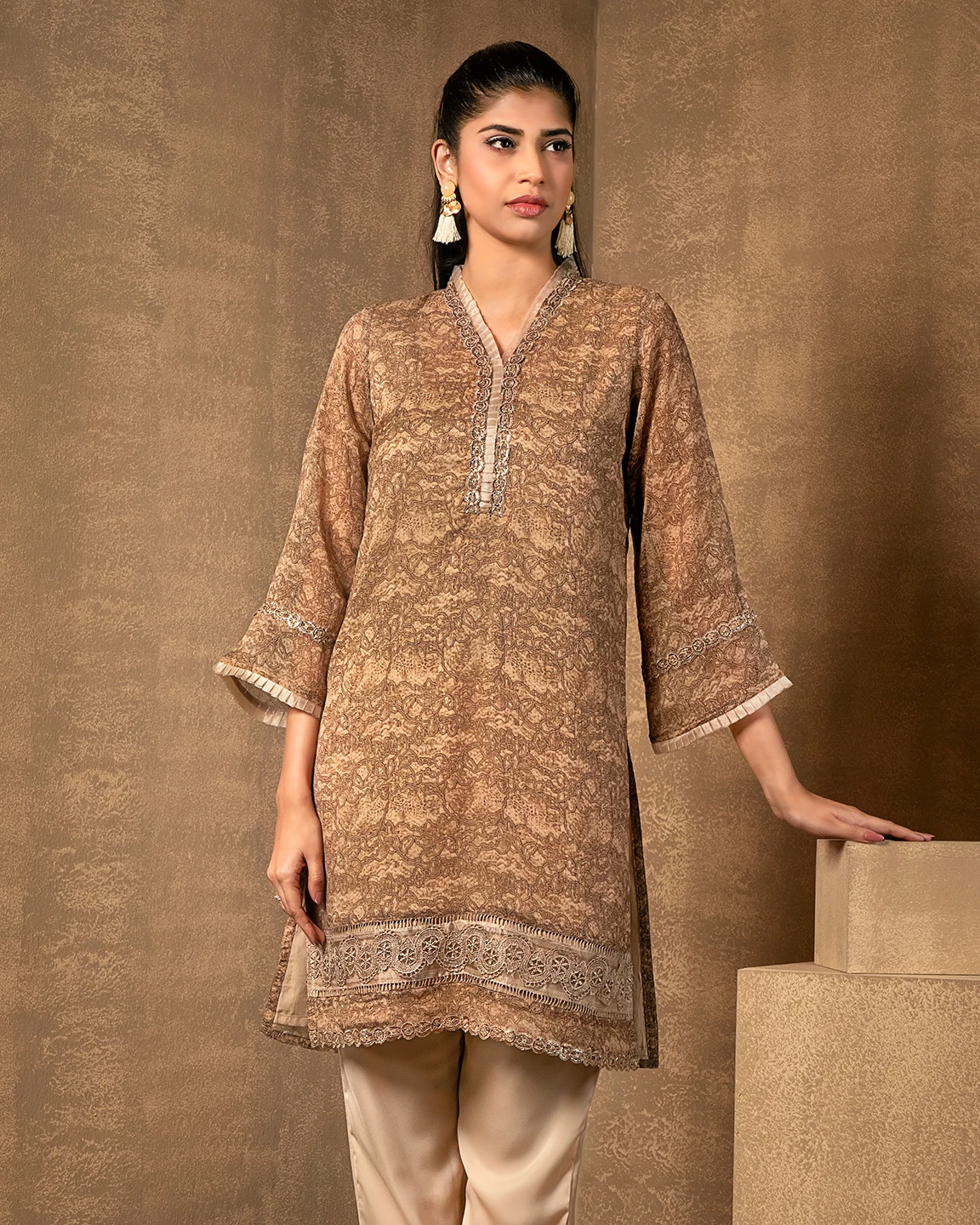 Ruffled V-neck Short Kameez With Lace | Warm Taupe