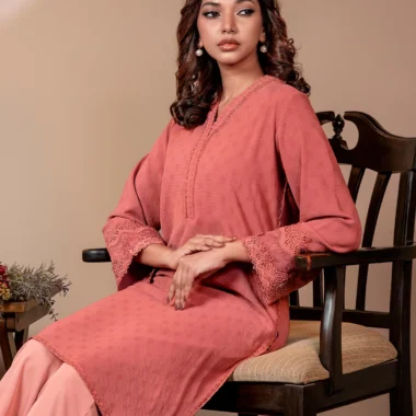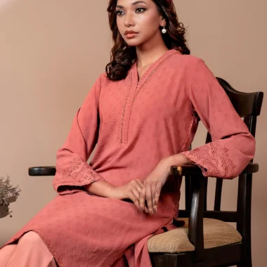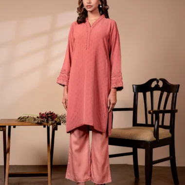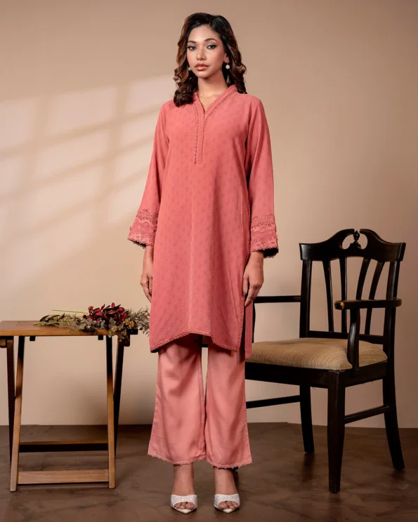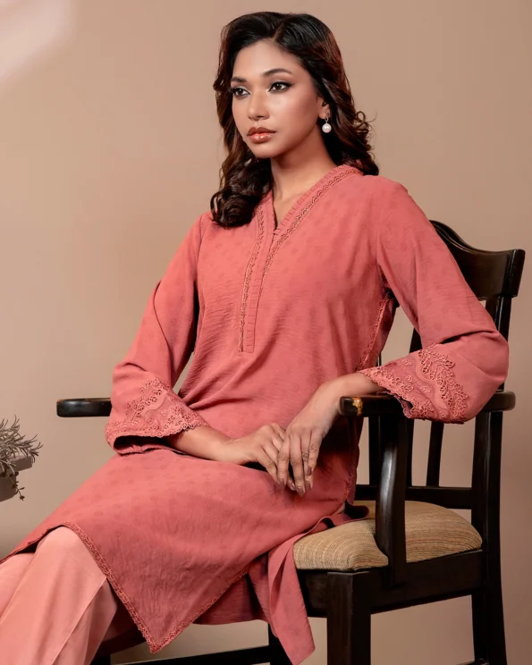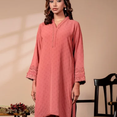 Textured Embroidered Cotton Blend Short Kameez | Mineral Red