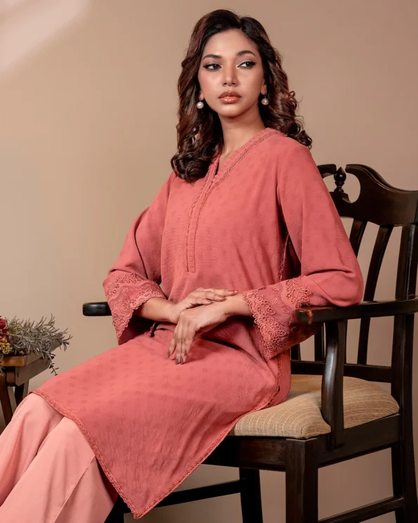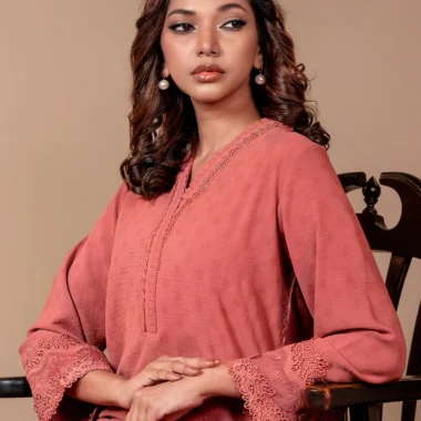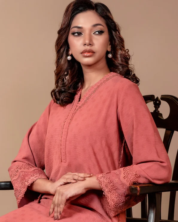 This warm Mineral Red offers understated charm with soft tonal embroidery, polka dot-textured fabric, and flared sleeves finished with delicate lace. Perfect for everyday elegance with a festive twist.