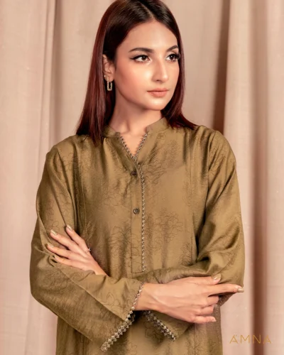 Female Band Collar With Lace & Button Details Co-ord set by Amna| Coffee