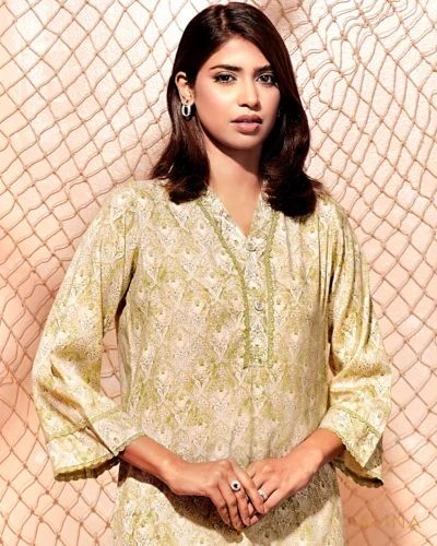 Printed cotton co-ord kurta & bottom set by AMNA | Light Green