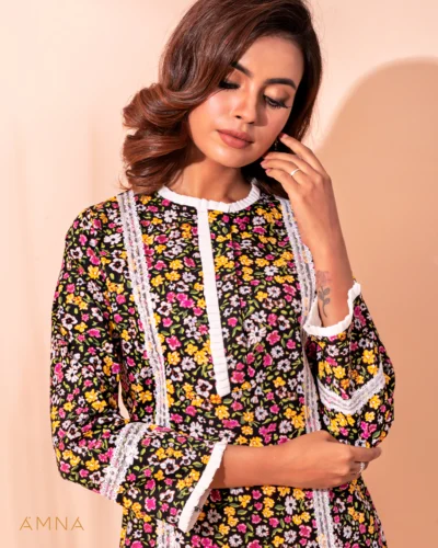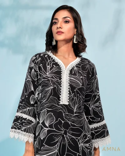 Printed cotton co-ord kurta and bottom set by AMNA | Black