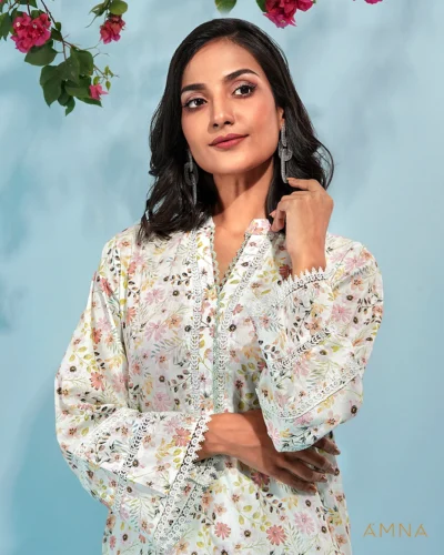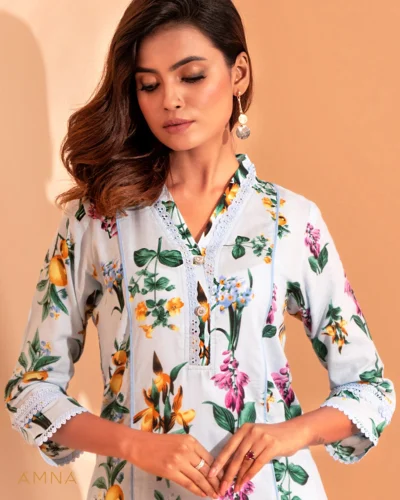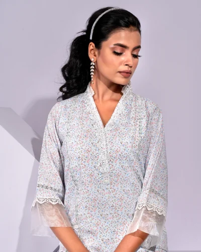 Printed cotton co-ord kurta & bottom set by AMNA | Star White