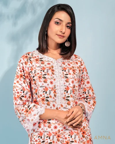 Printed cotton co-ord kurta & bottom set by AMNA | White