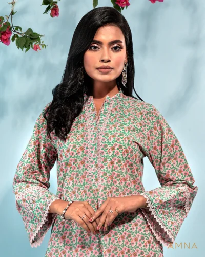 Printed cotton co-ord kurta & bottom set by AMNA | Light Green