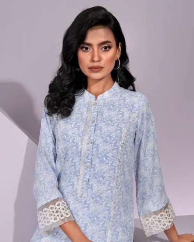 Female V- Neck Lace & Details Long Kamiz | Light Sky