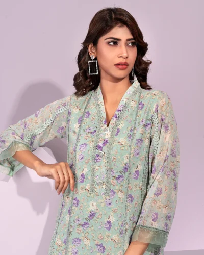 Female Round-Neck Lace & Details Long Kameez | Sea Green
