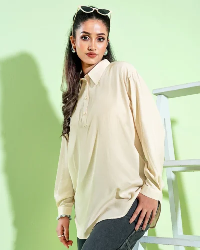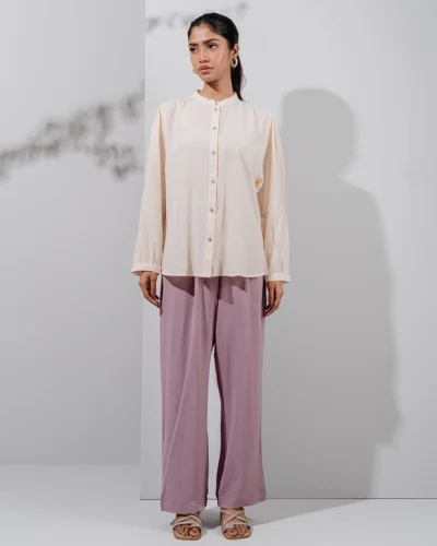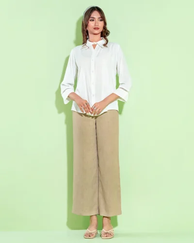 Female Band Collar With Contrast Lace Details Casual Top | White